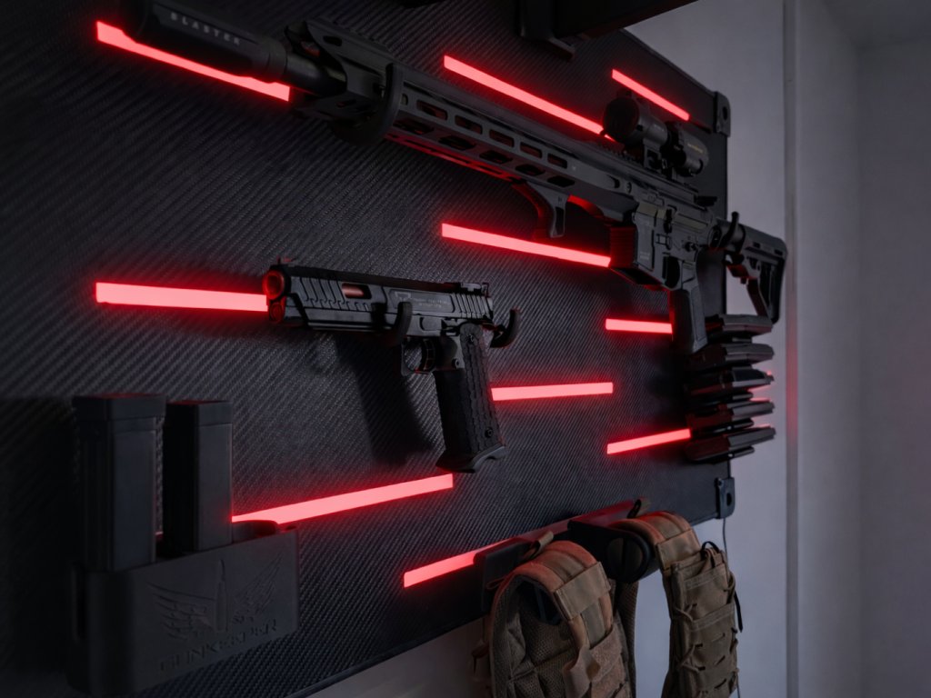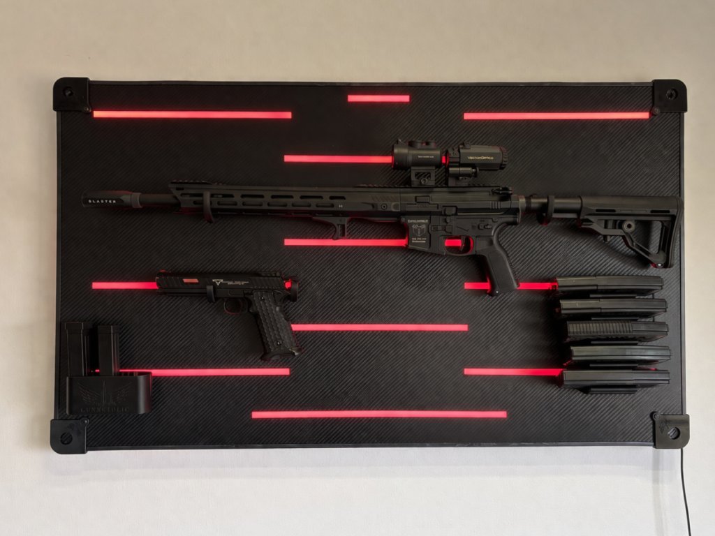 GunWall Standard je modulární nástěnný systém pro přehledné uložení výbavy a rychlý přístup. Díky čistému designu a možnosti rozmístění háků podle potřeby získáte organizovaný prostor – a navíc efektní RGB podsvícení.
